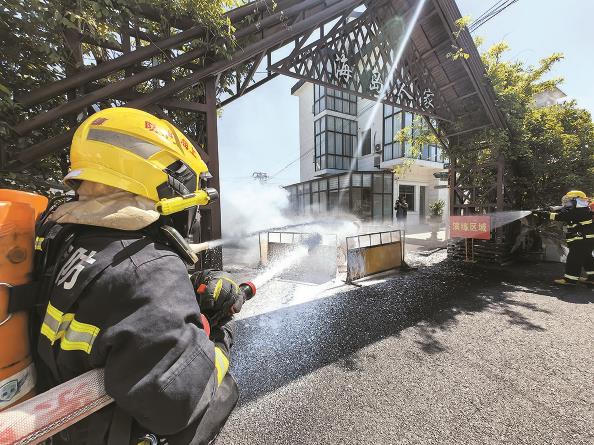 5月10日舉行的消防應(yīng)急演練中,電動(dòng)自行車自燃是關(guān)注重點(diǎn) 記者 張龍 通訊員 黃海華 攝