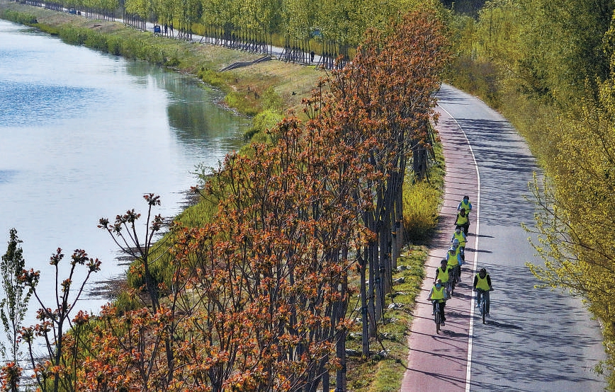 市民沿運(yùn)河一路騎行,徜徉在大自然中,感受鳥語(yǔ)花香。