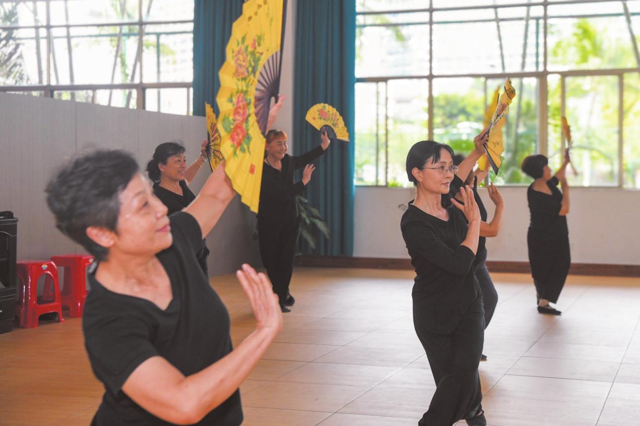 在四季華庭一期業(yè)主文化中心內(nèi),小區(qū)業(yè)主正跟隨著音樂練習(xí)扇子舞。