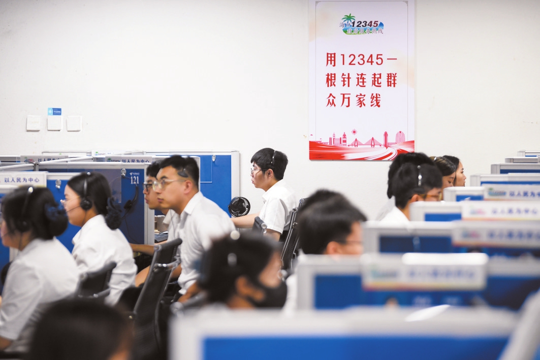 5月24日,在12345海口市民服務(wù)智慧聯(lián)動平臺話務(wù)間,工作人員正在接聽群眾熱線。