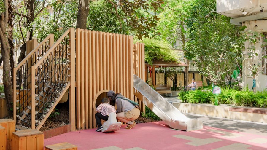最終,設(shè)計師圍著一棵廣玉蘭和一棵小桂花樹打造了“兒童游戲區(qū)”,設(shè)計了小小的樹屋滑梯,提供爬網(wǎng)與木樁小山的雙重攀爬選擇。木樁小山背后設(shè)計了一個超大的黑板墻?!耙庀氩坏降摹糜谩>游刹扛嬖V我們,孩子們在黑板上不只是涂涂畫畫,還能寫作業(yè)、算數(shù)學(xué)題。”