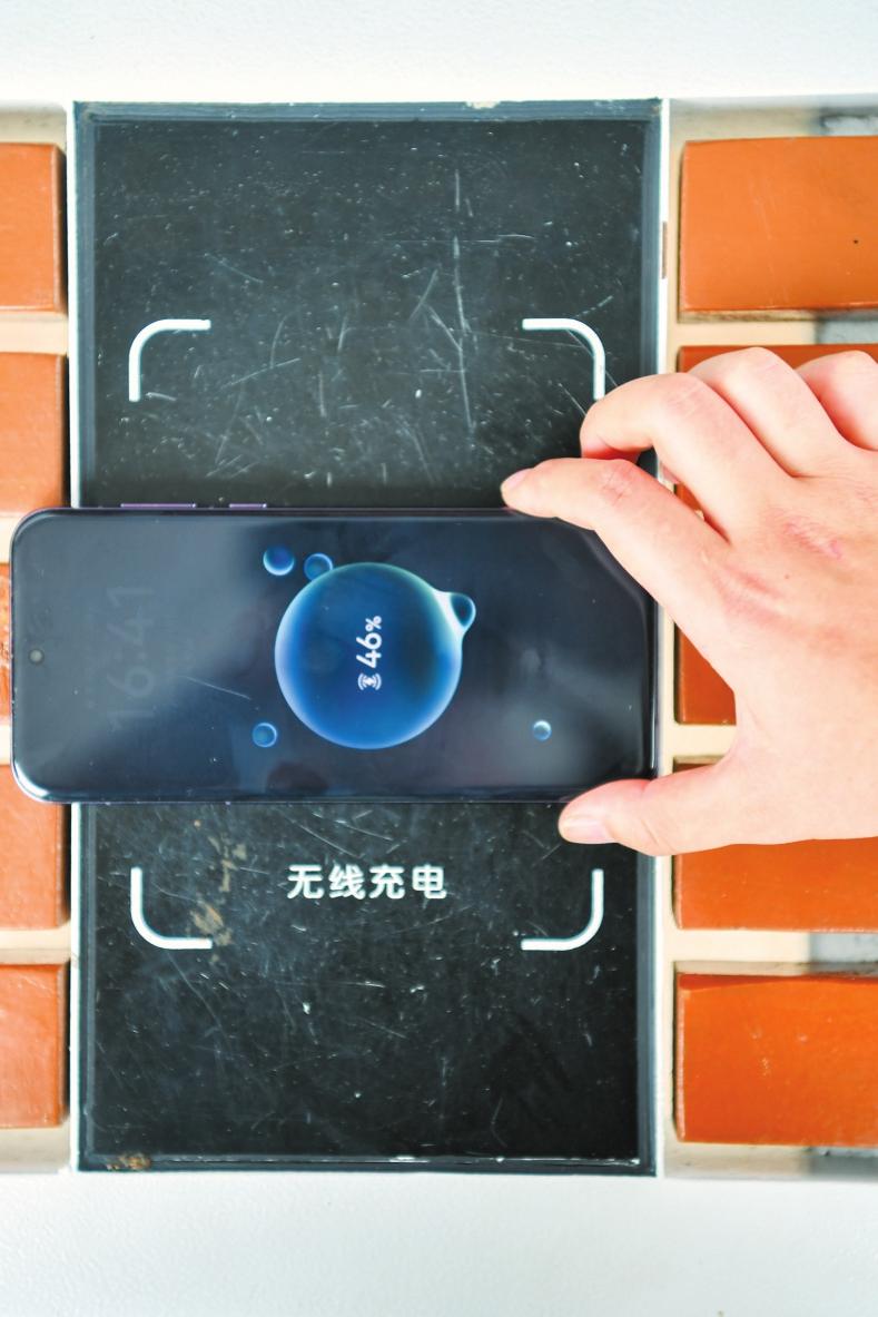 市民在智能公交站臺(tái),使用座椅旁的無(wú)線(xiàn)充電器為手機(jī)充電。記者 孫士杰 攝