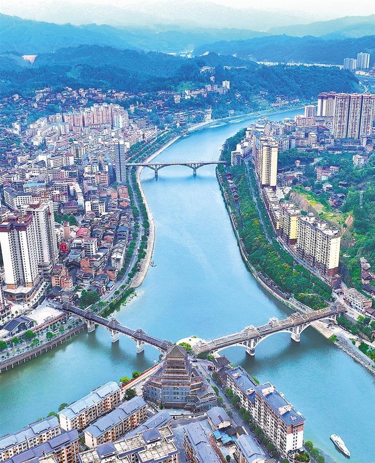 9月7日,俯瞰貴州省錦屏縣城區(qū),青山綠水、城市建筑相互映襯。近年來,當(dāng)?shù)貓猿稚鷳B(tài)優(yōu)先綠色發(fā)展,著力整治清水江周邊環(huán)境,生態(tài)環(huán)境進一步改善。姜繼標(biāo) 攝(中經(jīng)視覺)