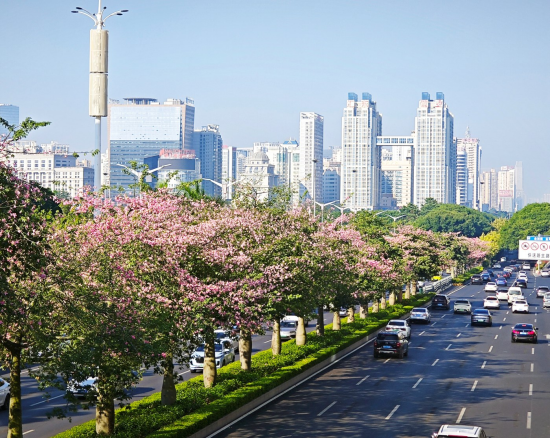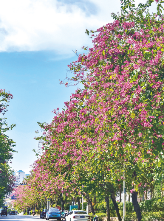 秋風拂過,城市各條道路、橋梁兩旁,綠樹和各色花朵相互映襯,演繹著專屬綠城的秋日浪漫。綠城南寧,“綠”是不變的底色。民族大道兩旁,異木棉花開一路,在綠樹映襯下分外美麗。古城路綠樹成蔭,機動車、行人穿行其間,陽光從樹葉間灑下。百花嶺路兩旁的羊蹄甲花競相開放,讓道路變成了花廊。邕城秋色中,又怎能少得了三角梅?良慶大橋上的三角梅熱情綻放,與從江上駛過的船只構(gòu)成了一幅寫意的畫卷……(記者 覃雨軒)