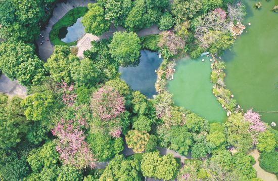 民族廣場上,孩子們在秋日暖陽下奔跑、與鴿子嬉戲;五象湖公園內(nèi),時??梢娛忻襁\動的身影,處處充滿無限的生機與活力;獅山公園里,落羽杉換上金黃色的“新衣”,仿佛秋天的使者,向人們傳遞季節(jié)的更迭;南湖公園里,蒜香藤形成紫色“瀑布”,讓人仿佛進入一個紫色的夢幻世界;青秀山風景區(qū)層林盡染,人們在葉子花園里拍照打卡,在金杉湖邊漫步……