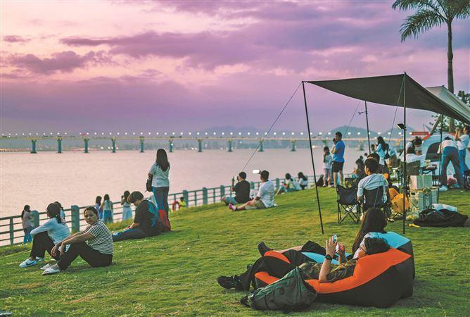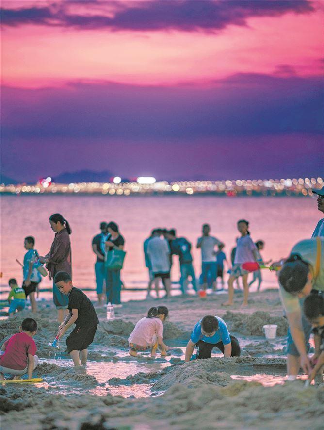 落日余暉千百態(tài),瀏江古渡荻花洲。傍晚海風(fēng)習(xí)習(xí)的海灘上,露營(yíng)的家庭、玩沙的孩童、拍夕陽(yáng)的情侶,都為愜意的海灣悠閑添上了幾分松弛感。