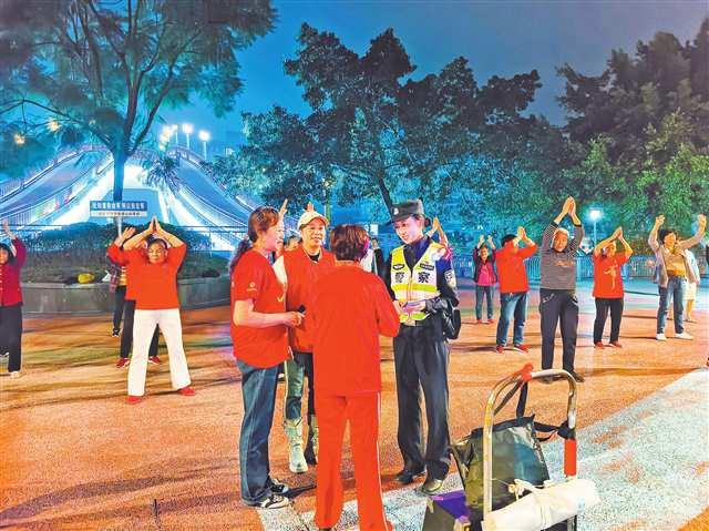 重慶市綦江區(qū)社區(qū)民警帶領(lǐng)網(wǎng)格員勸導(dǎo)“壩壩舞”隊(duì)伍控時(shí)降噪。