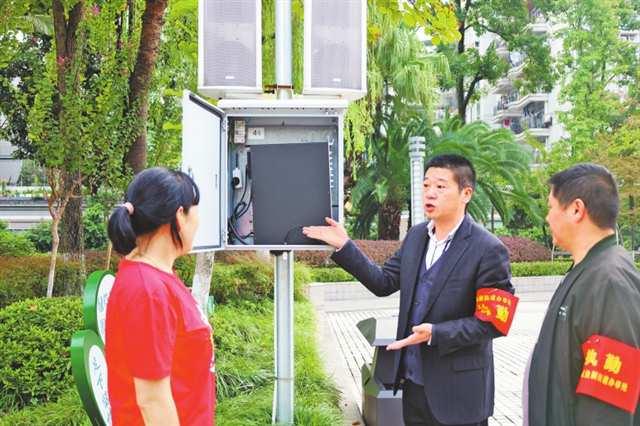 重慶市巴南區(qū)魚洞街道工作人員向“壩壩舞”愛好者介紹“立柱音響”使用方法。