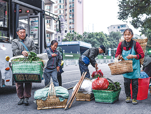 菜農在貴陽市大營坡終點站下車,準備將蔬菜就近售賣(11月7日攝)。