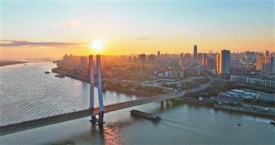南昌市八一大橋和贛江兩岸的城市建筑群沐浴在深秋的晨光中。易江然子攝