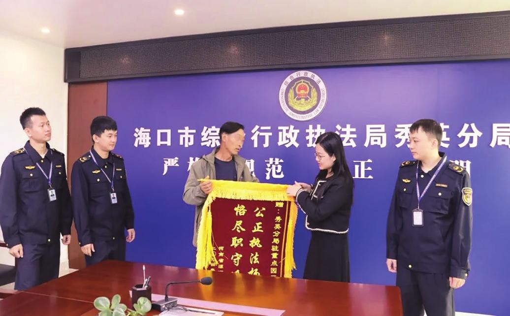 11月27日,河南籍民工朱先生向海口市綜合行政執(zhí)法局秀英分局贈送錦旗。林小映 攝