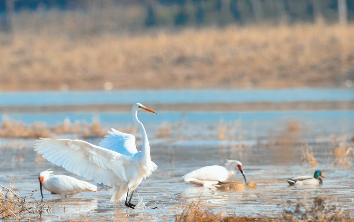 1月5日,朱鹮和白鷺等鳥(niǎo)類(lèi)在咸陽(yáng)市細(xì)柳營(yíng)濕地覓食。2024年10月,24只朱鹮在此野化放飛,目前它們已基本適應(yīng)這里的環(huán)境。周季 攝