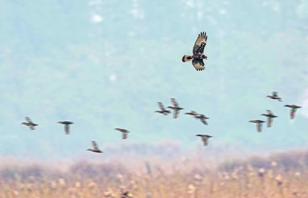 2024年12月15日,岳陽市屈原管理區(qū)營田鎮(zhèn),國家二級保護動物白腹鷂在空中巡視,一群綠翅鴨從它腳下快速飛過。