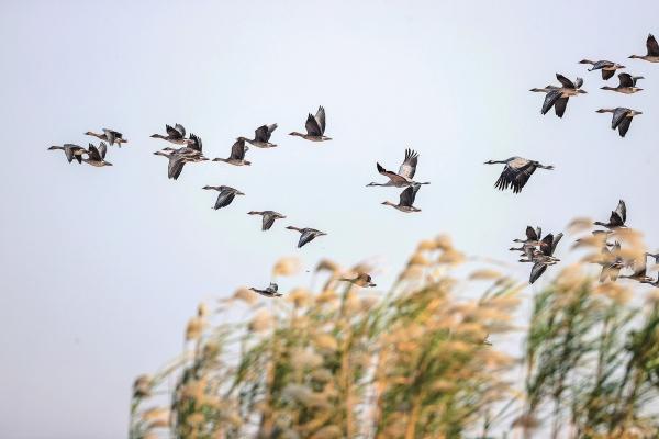 1月24日,岳陽市采桑湖,一群短嘴豆雁眾星拱月般地圍繞著兩只國家二級保護動物灰鶴,灰鶴當仁不讓,居中飛行。