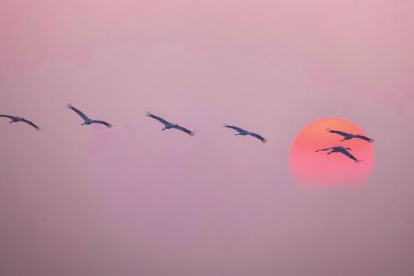 1月8日,臨湘市黃蓋湖,國家一級保護動物白鶴穿日而過。白鶴全球數量6000多只,繁殖于西伯利亞,長江中游是其最重要的越冬地。