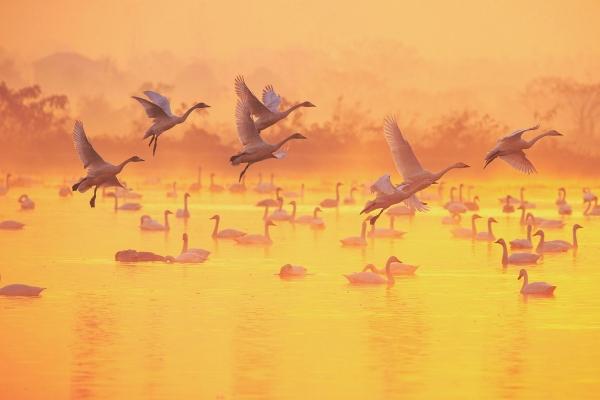 晨霧中,小天鵝舒展修長脖頸,在水面上優(yōu)雅起舞。來自西伯利亞的小天鵝連續(xù)5年來到岳陽市屈原管理區(qū)“打卡”,數量從1000多只增加到3000多只。