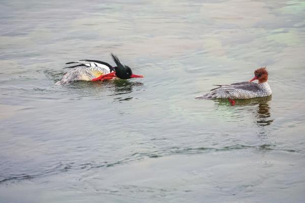 2月8日,桃源水電站大壩下方淺灘水域,國家一級保護動物中華秋沙鴨在梳理羽毛。