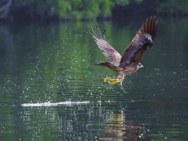 1月27日,長沙市雨花區(qū)跳馬鎮(zhèn),國家二級保護動物黑鳶在空中盤旋,發(fā)現魚浮出水面,迅速俯沖將其捕獲,然后帶到安全的地方享用。