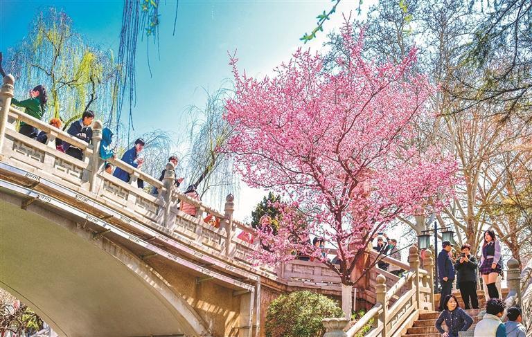 走進(jìn)興慶宮公園,便踏入了一片花的海洋。大片的美人梅熱烈地盛開著,吸引眾多市民游客前來打卡。與此同時(shí),公園內(nèi),湖邊的柳樹吐出嫩芽。市民游客在公園漫步,享受著春日暖陽與花香草綠帶來的愜意。