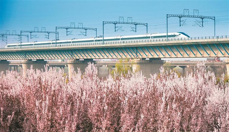 一列高鐵列車駛過渭河大橋,在紅葉李花映襯下宛如“開往春天的列車”。