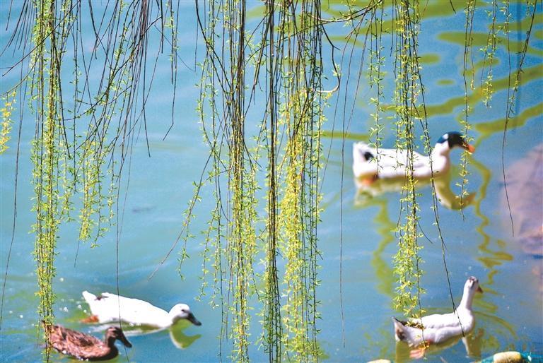 柳樹悄然吐新芽,鴨子在水中游弋。