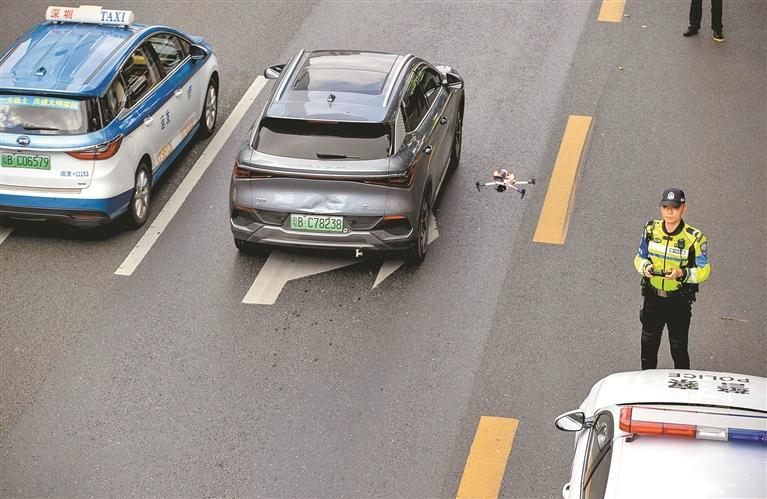 福田大隊(duì)機(jī)訓(xùn)中隊(duì)副中隊(duì)長李海峰告訴記者,無人機(jī)實(shí)時對違法行為進(jìn)行抓拍取證,快速準(zhǔn)確定位。路面警力即刻響應(yīng)、快速攔截查處,大幅提升了執(zhí)法效率。即使現(xiàn)場沒有及時攔截住違法車輛,通過無人機(jī)執(zhí)法抓拍的整段視頻也可以完整展現(xiàn)違法過程,后續(xù)進(jìn)行調(diào)查處理?!吧钅洗蟮缹儆诙壪扌袇^(qū),違規(guī)駛?cè)朐撀范蔚?,我們依法按沖禁令進(jìn)行處罰并查扣車輛?!崩詈7逭f。