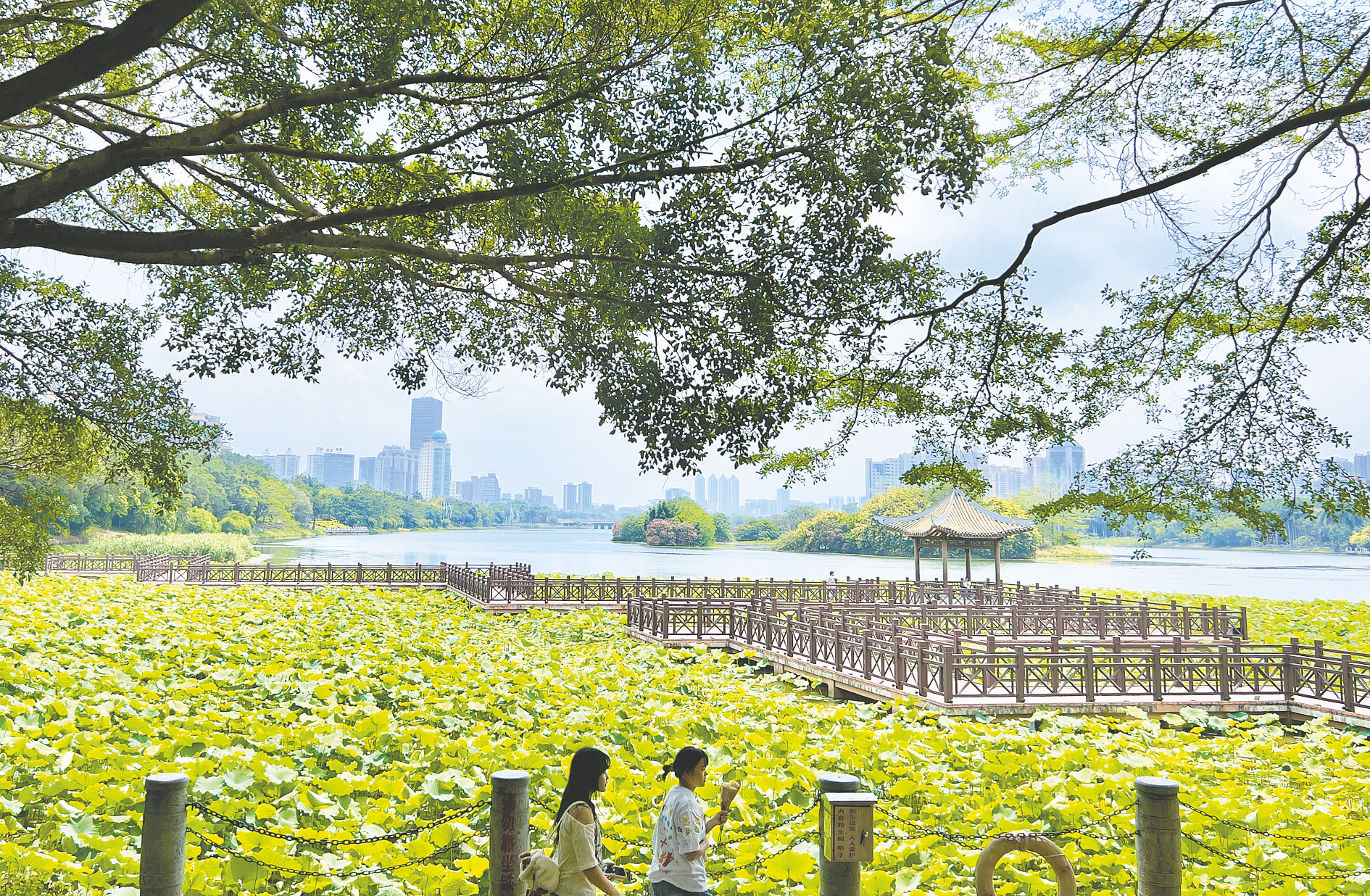 圖為南湖公園九曲橋邊蓮葉田田。(記者 潘浩 攝影報道)