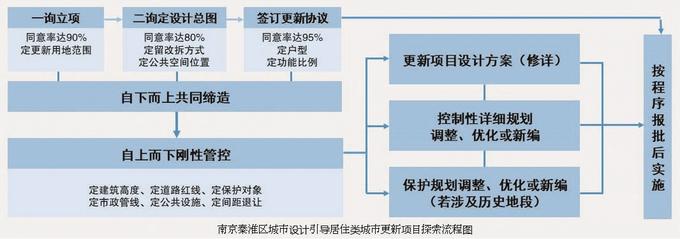 依據市級相關政策文件,結合項目實踐,南京秦淮區(qū)探索“自下而上多輪協(xié)商→自上而下規(guī)劃管控→修詳設計方案→控詳規(guī)劃優(yōu)化調整→初步設計→施工圖設計→建設實施→后續(xù)運營”聯(lián)動管理機制??卦敗⑿拊斠?guī)劃承接協(xié)商意見和管控要求,指導、支撐城市更新實踐。