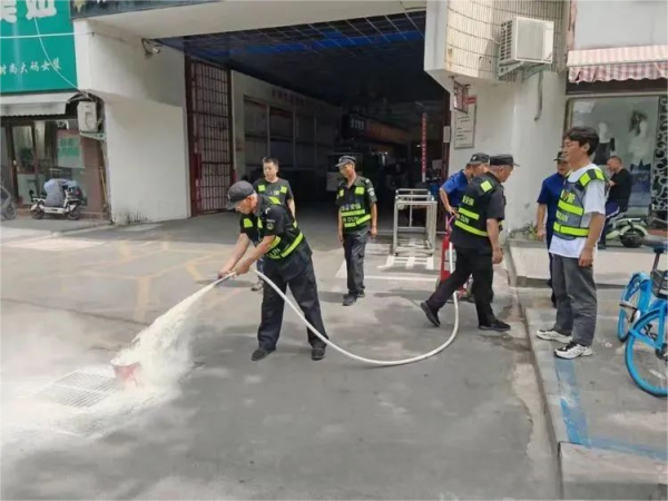 隨后,戶外消防演練正式啟動(dòng)。安全員現(xiàn)場(chǎng)演示“一提二拔三握四壓”的滅火器規(guī)范操作流程,進(jìn)一步烘托出嚴(yán)肅有序的學(xué)習(xí)氛圍。隨后,身著反光條制服的應(yīng)急隊(duì)伍迅速集結(jié),模擬市場(chǎng)突發(fā)火情場(chǎng)景。一名隊(duì)員熟練持起消防水管對(duì)準(zhǔn)“火源”噴射,其他隊(duì)員協(xié)同配合完成警戒疏散、初期滅火等關(guān)鍵環(huán)節(jié),整個(gè)過程銜接緊密、操作規(guī)范,充分展現(xiàn)城管應(yīng)急隊(duì)伍的實(shí)戰(zhàn)素養(yǎng)。