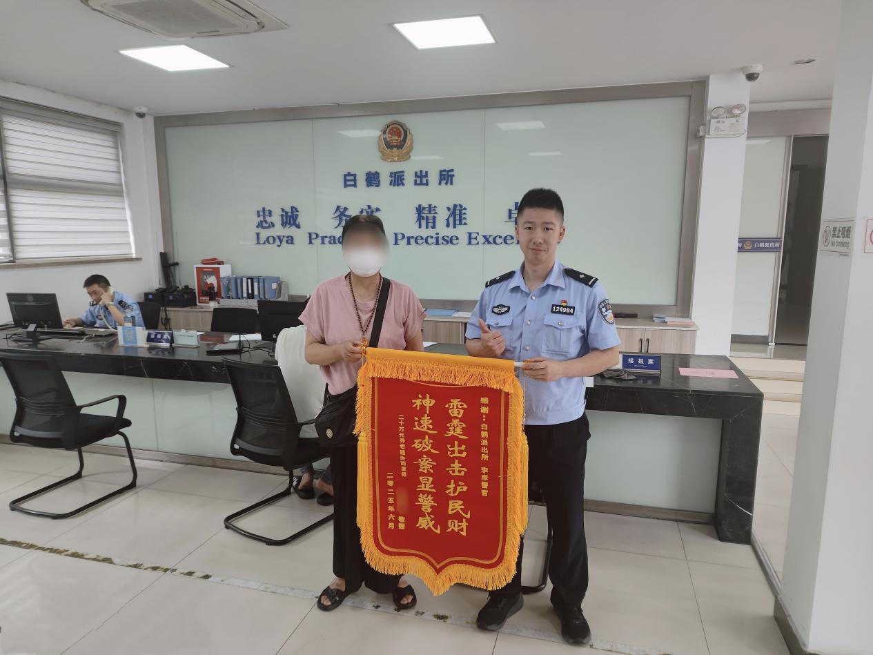 6月25日,家住浙江省寧波市鄞州區(qū)的徐女士手持錦旗和感謝信來到寧波市公安局鄞州分局白鶴派出所,向?yàn)槠渥坊?0萬元養(yǎng)老金的民警李彥及白鶴派出所所長(zhǎng)陳世波表示感謝。
