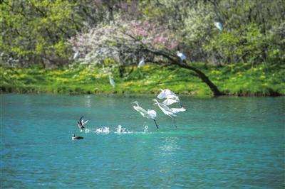 水質(zhì)澄澈,是河流的靈魂。曾幾何時(shí),汾河蒙塵。而今,清流滌蕩污濁,終于喚醒了沉睡的見證者——被譽(yù)為“活體水質(zhì)檢測器”的桃花水母,在四期水域輕盈旋舞,近乎透明的傘蓋如精靈般浮動(dòng)。清波之下,是萬物生長的秘境;碧水之上,是羽翼的樂園。天鵝、白鷺、蒼鷺、斑嘴鴨……上百種鳥兒于此棲息,它們翅膀的每一次扇動(dòng),都是對(duì)汾河生態(tài)最真實(shí)的肯定。騎行者在綠道上飛馳,身影融入兩岸的錦繡;游人漫步木棧道,步伐隱沒在流動(dòng)的詩意里;沿岸居民推窗見綠,汾河終于找回了它清亮的歌喉。