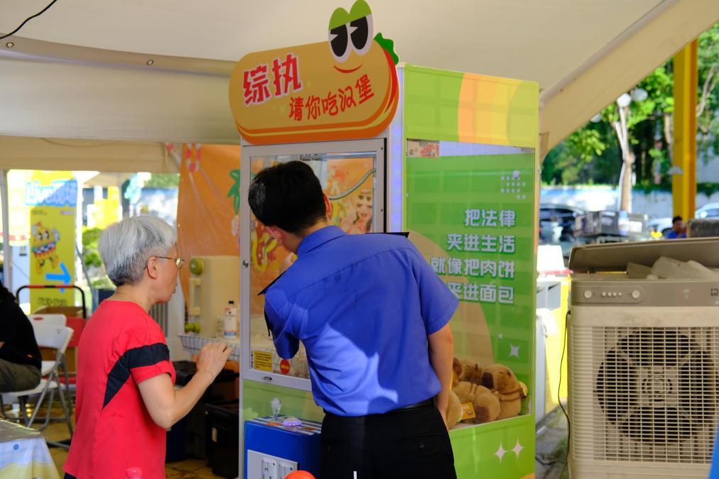作為城市潮流地標(biāo),集盒廣場(chǎng)在青年群體中樹立了獨(dú)特的“潮工作、玩生活”品牌形象。因此,屬地東勝中隊(duì)在開展普法宣傳過程中,兼顧街區(qū)運(yùn)營(yíng)主體與商戶核心訴求、青年群眾體驗(yàn)需求與價(jià)值認(rèn)同,積極借助集盒廣場(chǎng)舉辦寧波咖啡生活周、漢堡節(jié)、暑期夜市等大規(guī)模集市期間的青年群體集聚效應(yīng),深挖街區(qū)文化地標(biāo)與潮流IP潛力,在果殼箱、綠化帶、共享單車停放點(diǎn)等顯著位置上設(shè)置綜合執(zhí)法Q版形象普法牌,以“一句話”形式生動(dòng)傳遞法律知識(shí)、引導(dǎo)文明行為。同時(shí),創(chuàng)新推出“綜執(zhí)請(qǐng)你吃漢堡”等主題攤位,精心設(shè)計(jì)“知識(shí)問答+潮玩互動(dòng)+獎(jiǎng)品兌換”的普法鏈條,參與者通過挑戰(zhàn)法律知識(shí)問答,贏取娃娃機(jī)游戲幣來抓取捆綁著漢堡兌換券的幸運(yùn)玩偶,再在漢堡節(jié)上進(jìn)行任意兌換。這種將嚴(yán)肅法律條文轉(zhuǎn)化為趣味挑戰(zhàn)的“游戲化”普法模式,顛覆了傳統(tǒng)的單向宣傳方式,通過互動(dòng)性與獲得感的雙重驅(qū)動(dòng),讓法律知識(shí)在歡聲笑語(yǔ)中沁入人心。