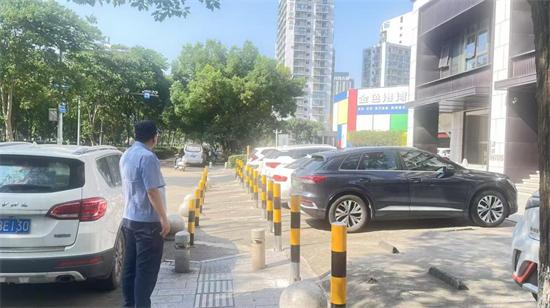 投訴信息傳來時已近傍晚,執(zhí)法中隊隊員顧不上休息,第一時間趕赴現(xiàn)場。在酒店門口,隊員們看到人行道邊緣的隔離樁明顯向外突出,原本供行人通行的區(qū)域被壓縮,路段被車輛堵住去路,確如市民所說存在繞行情況。“當(dāng)時就覺得,哪怕只是幾厘米的侵占,也會影響行人安全,必須盡快處理?!眻?zhí)法人員說道。