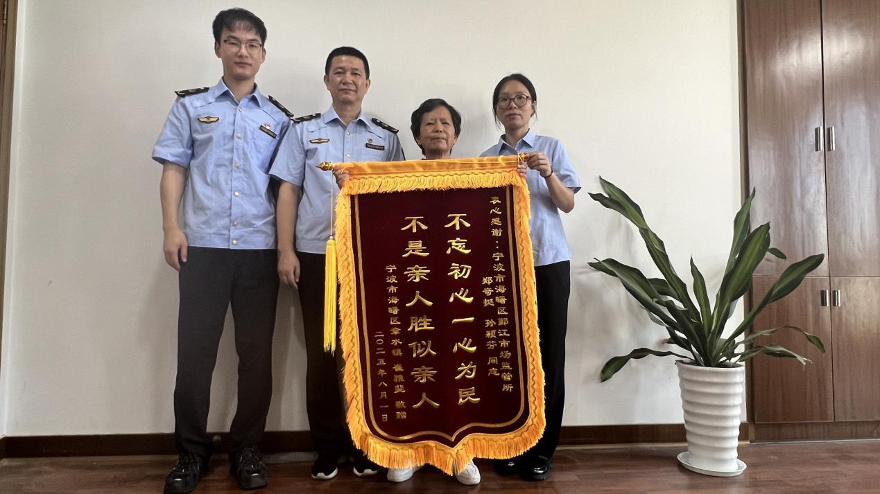 近日,消費(fèi)者崔女士將一面寫(xiě)著“不忘初心一心為民 不是親人勝似親人”的錦旗送到浙江省寧波市海曙區(qū)鄞江市場(chǎng)監(jiān)管所,字里行間滿(mǎn)是對(duì)工作人員高效服務(wù)的肯定與感激,為炎炎夏日里的政務(wù)服務(wù)窗口帶來(lái)了一陣沁人心脾的清風(fēng)。