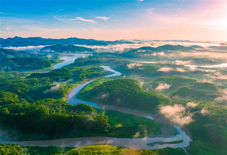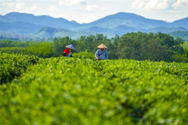 晨霧中的白沙黎族自治縣萬畝茶園,茶香氤氳,綠美宜人,熱帶雨林的生態(tài)綠韻,溪流映著蝶影,仿佛步入一幅生動(dòng)的山水畫卷。