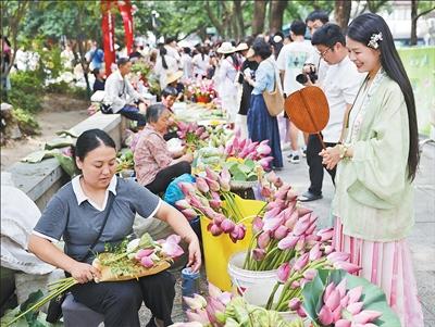 市集里,不少攤主是本地農(nóng)戶。每天清晨,年過(guò)七旬的沈秋云都會(huì)挑著自家種的荷花前來(lái)售賣;攤主張小蘭自稱“花老板”,在自家攤位前笑迎顧客……一個(gè)個(gè)普通農(nóng)戶在這里擺出小攤,售賣應(yīng)季的鮮花和農(nóng)產(chǎn)品,逐漸形成了頗有名氣的“荷花市集”。