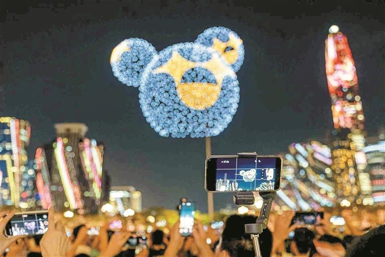 無人機(jī)組成的萌萌奶龍,吸引市民爭相拍照。