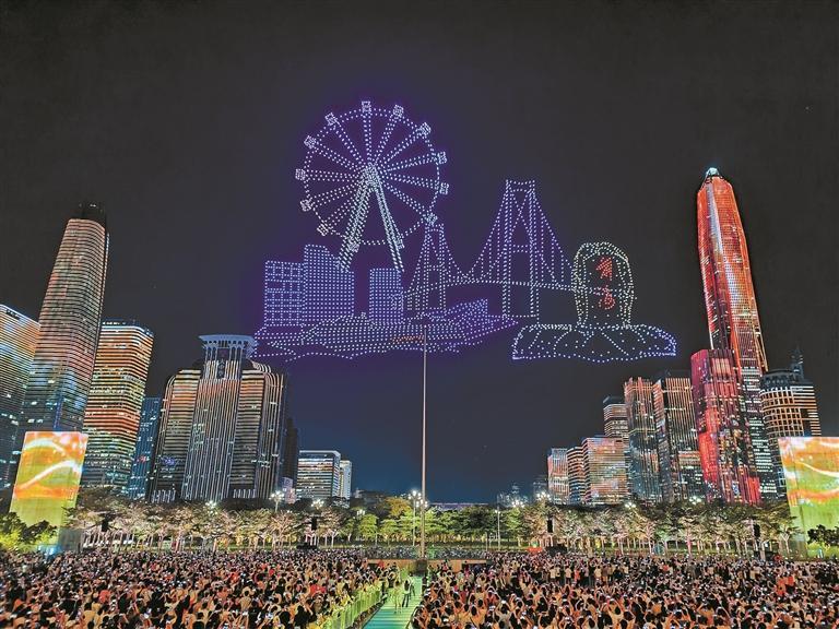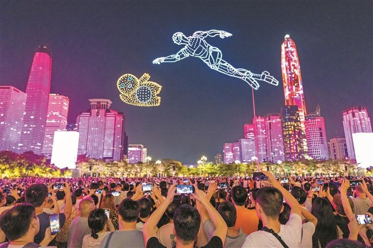 當(dāng)無人機(jī)陣列掠過夜空,地面建筑群也將隨之脈動(dòng)。流光從云端灑向樓宇,色彩如呼吸般明滅變幻,天地連成一體。霓虹勾勒出特區(qū)發(fā)展長卷,光影流轉(zhuǎn)中浮現(xiàn)特區(qū)精神的時(shí)代符號——這是一座城市向自己的生日深情致敬。