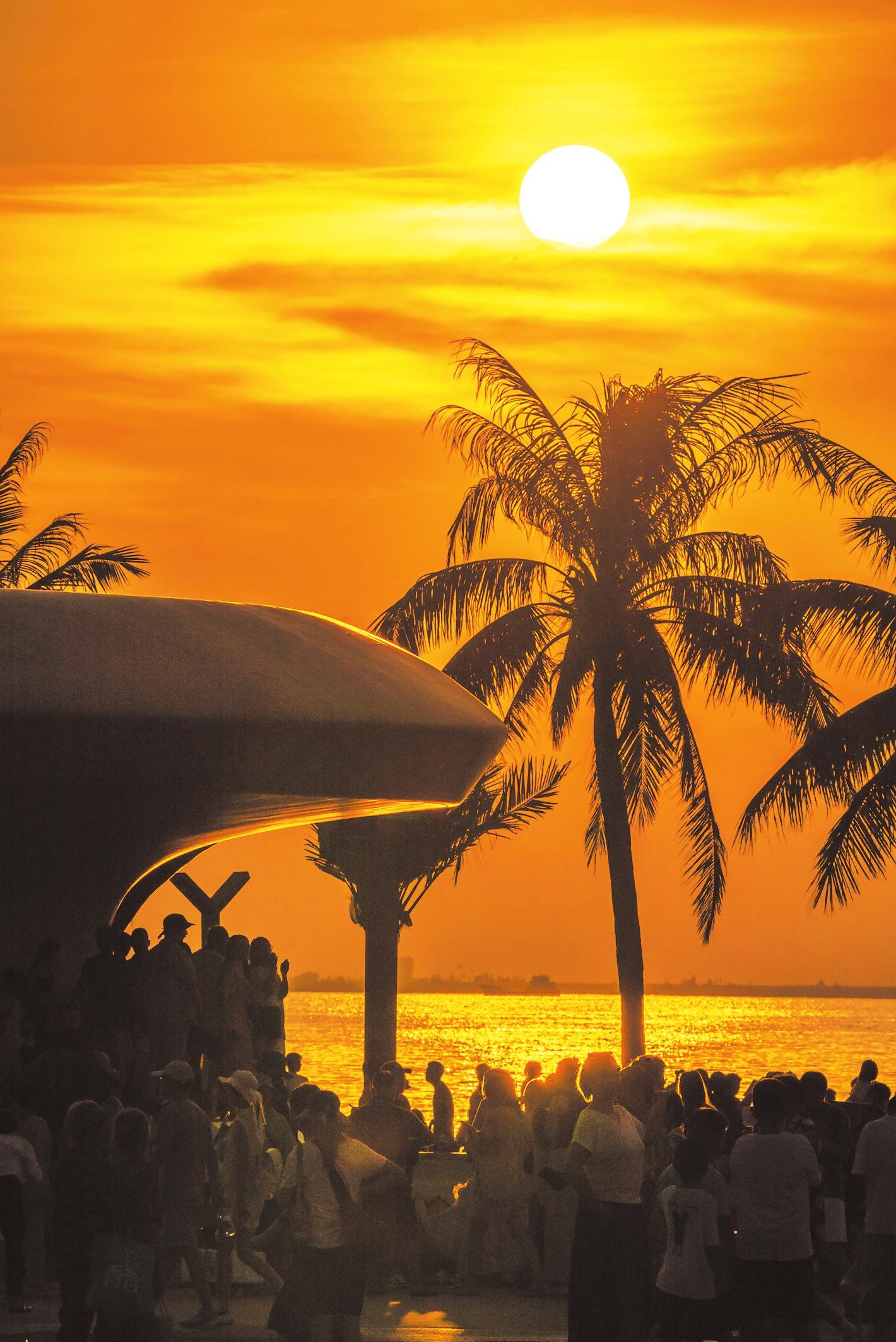 在??跒呈兰o公園云洞圖書館旁,市民游客在海岸邊欣賞落日美景。記者 楊鶴 攝