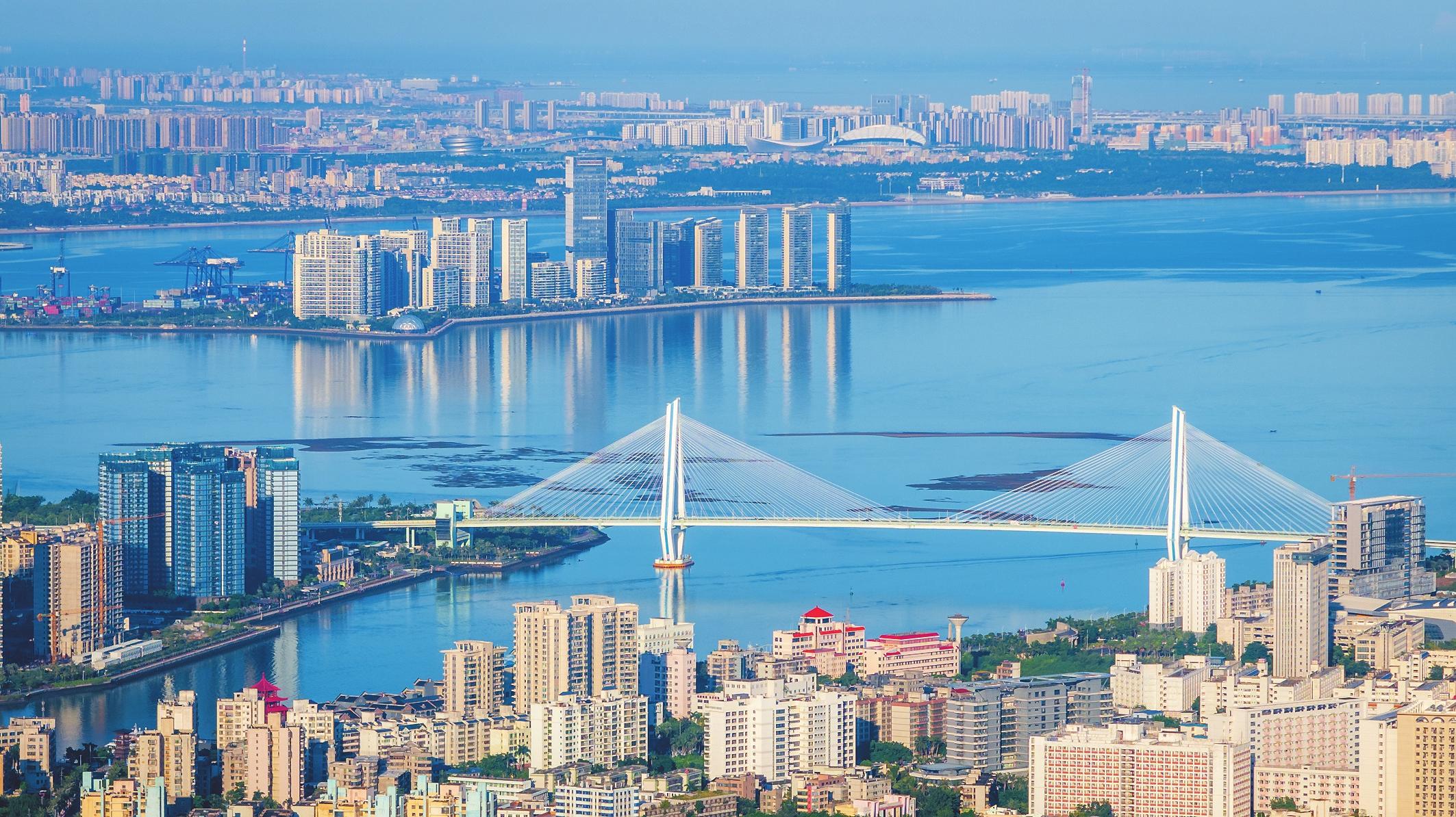 從高空俯瞰???,城市與江海相融,高樓林立、跨海大橋在光影里舒展,薄霧輕籠處,新舊景致交織,椰城清晨美極了。記者 楊鶴 攝