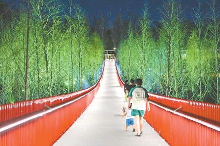 離開液店再向東,過(guò)了宋莊路,就來(lái)到了涼水河畔的霧森水廊區(qū)。從涼水河主河道引出的水系,蜿蜒在綠樹間,一艘艘透明的小船在湖面上游蕩,尤其是夜幕降臨后,燈光秀一亮,水域瞬間變成了夢(mèng)幻的童話世界。128米長(zhǎng)的聽風(fēng)橋,從變幻著色彩的森林間穿過(guò),隨便一拍就是大片。林下市集的烤肉和咖啡的香味,則讓煙火氣十足。