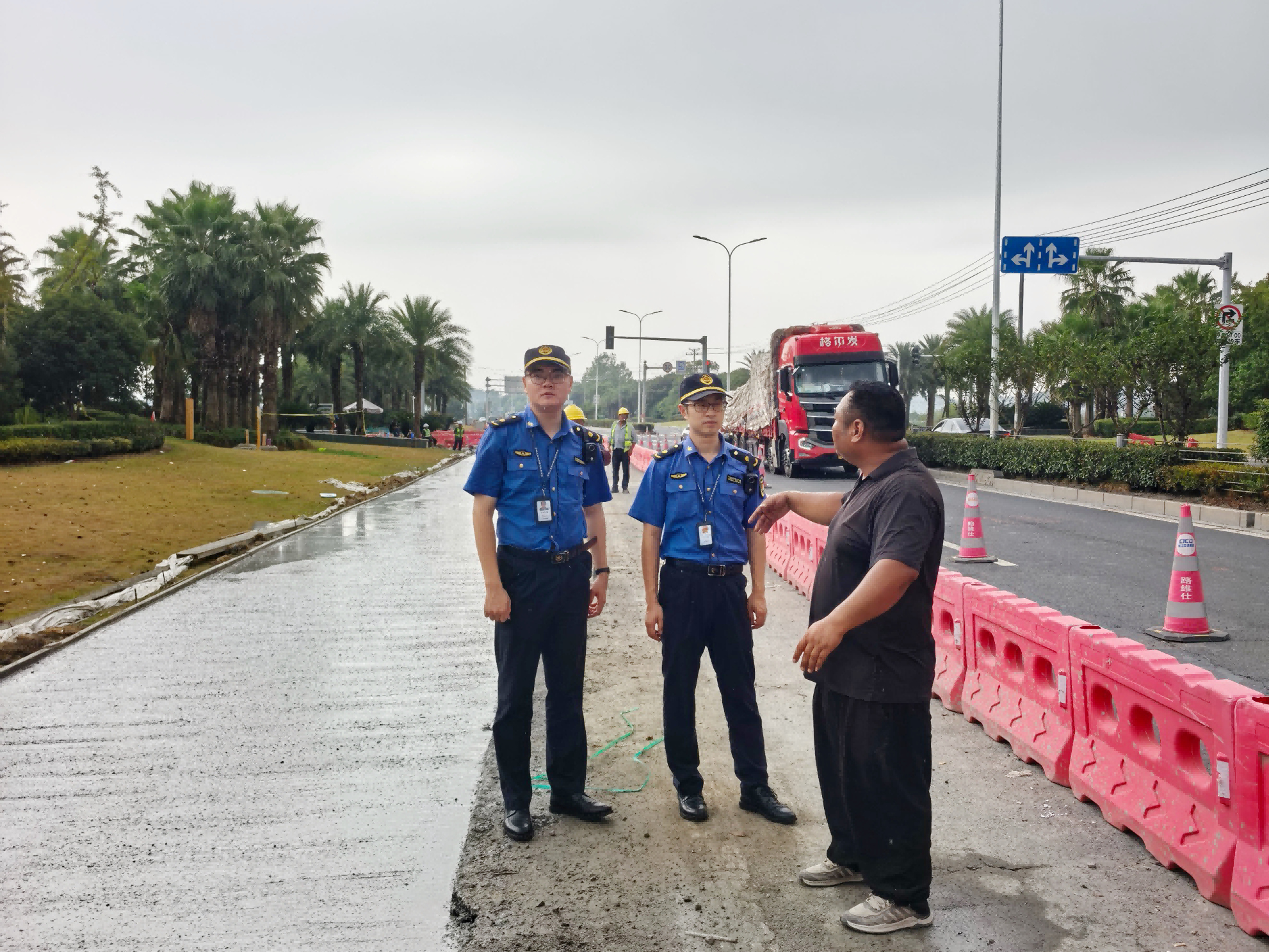 執(zhí)法人員與施工方現(xiàn)場商量解決方案