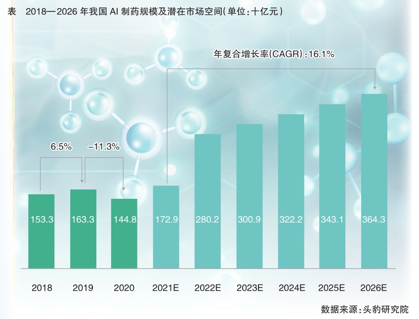 AI制藥的市場(chǎng)增速和空間與創(chuàng)新藥市場(chǎng)占比、AI技術(shù)迭代升級(jí)都息息相關(guān)。頭豹研究院預(yù)計(jì),根據(jù)目前我國(guó)醫(yī)藥市場(chǎng)情況,以及AI制藥各市場(chǎng)主體的在研項(xiàng)目情況,未來(lái)創(chuàng)新藥市場(chǎng)占整體醫(yī)藥市場(chǎng)的比例或?qū)⑦_(dá)到15%;預(yù)計(jì)我國(guó)AI制藥在2021—2026年期間的年復(fù)合增長(zhǎng)率(CAGR)為16.1%,2026年的潛在市場(chǎng)空間將達(dá)到3643億元。