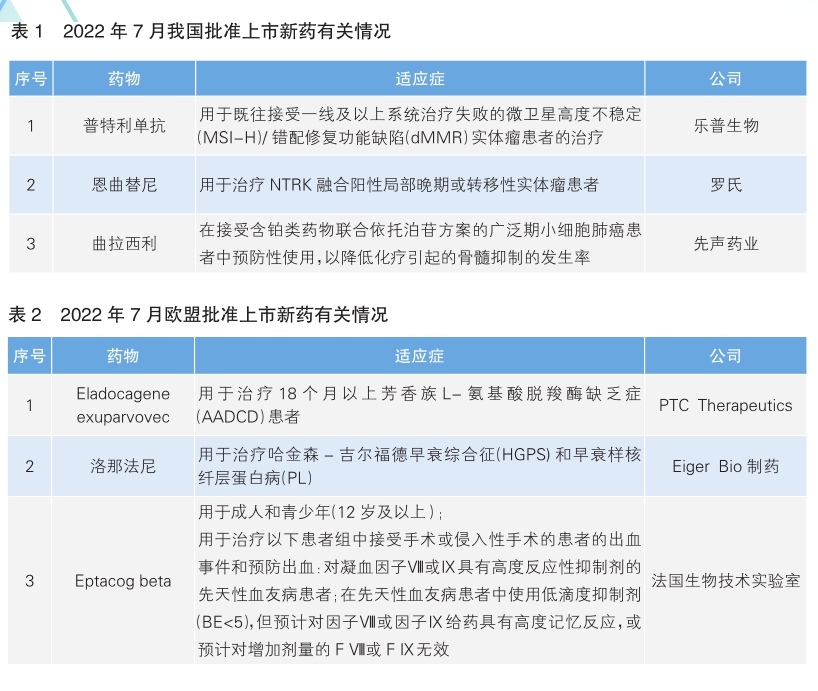 7月份,我國共批準(zhǔn)3款新藥上市(詳見表1),其中附條件批準(zhǔn)的普特利單抗為我國藥企樂普生物自主研發(fā)。