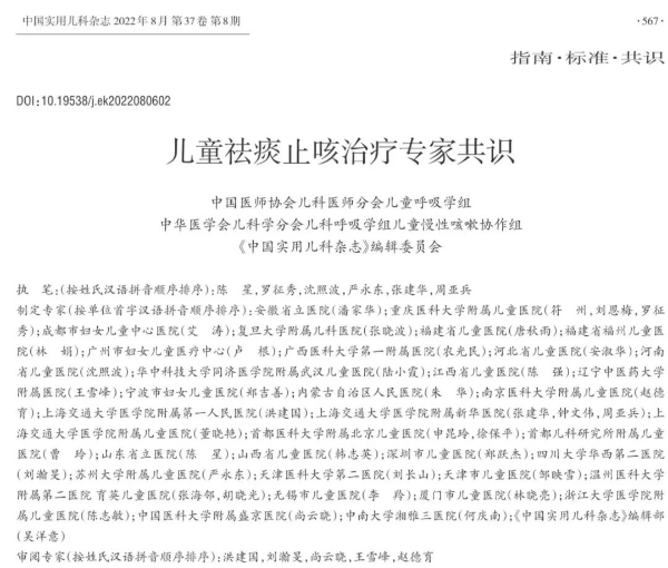 近日,由中國醫(yī)師協(xié)會兒科醫(yī)師分會兒童呼吸專家組、中華醫(yī)學會兒科學分會兒科呼吸學組兒童慢性咳嗽協(xié)作組、《中國實用兒科雜志》編輯委員會發(fā)起,組織全國40位專家制定了《兒童祛痰止咳治療專家共識》,該共識發(fā)布于中國實用兒科雜志2022年8月第37卷第8期。