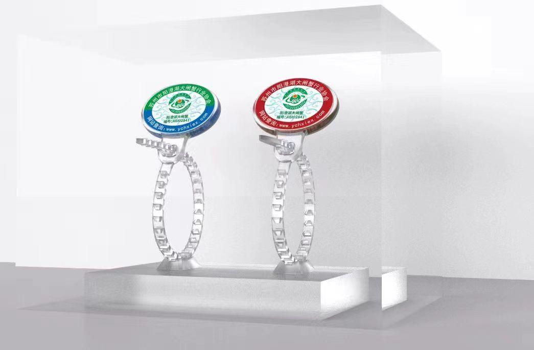 協(xié)會根據(jù)養(yǎng)殖戶的養(yǎng)殖面積,按照大閘蟹成熟度分批次發(fā)放防偽蟹扣。2022年版陽澄湖大閘蟹農(nóng)產(chǎn)品地理標志防偽專用標識分為兩種,一種是深紅色,代表陽澄湖湖區(qū)的大閘蟹;另一種是綠色加藍色,代表高標準養(yǎng)殖池塘的大閘蟹。通過顏色,消費者很容易辨別蟹的產(chǎn)地。