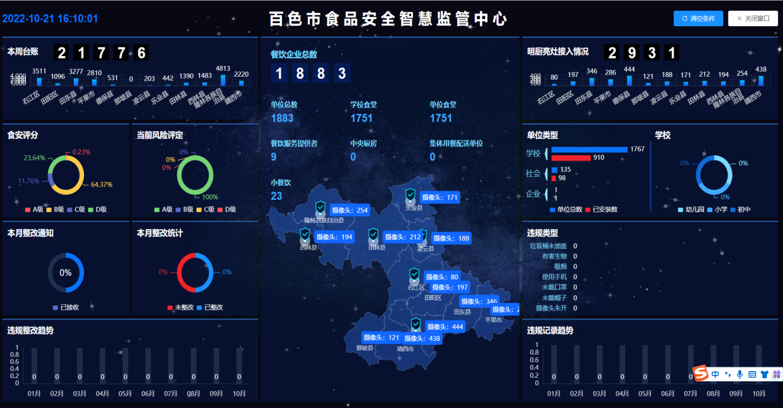 2022年6月,百色市人民政府印發(fā)《百色市學(xué)校食堂“互聯(lián)網(wǎng)+明廚亮灶”建設(shè)工作方案》,百色市建設(shè)了食品安全智能服務(wù)平臺(tái),并于2022年7月正式啟用?,F(xiàn)已完成全市學(xué)校食堂以及集體配餐單位“互聯(lián)網(wǎng)+明廚亮灶”100%全覆蓋建設(shè)。