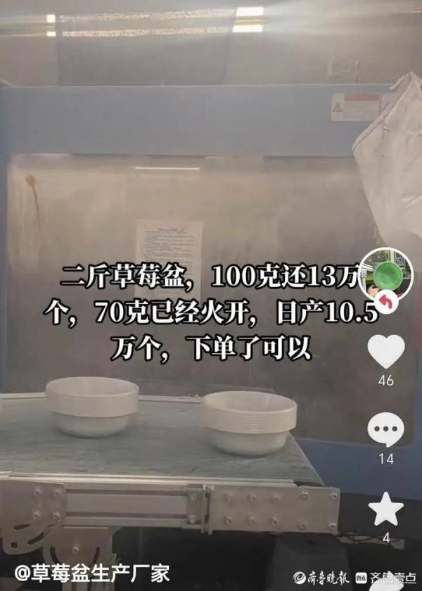 據(jù)介紹,越輕的盆,使用材料就越好,而且透明度等各方面都更好些。但是越重的盆,材料就越差?!耙?yàn)樵街氐呐瑁砑觿┰蕉?。其?shí)去掉原材料成本,70克重和100克重的草莓盆其他的成本是一樣的?!睆埾壬嘎?。