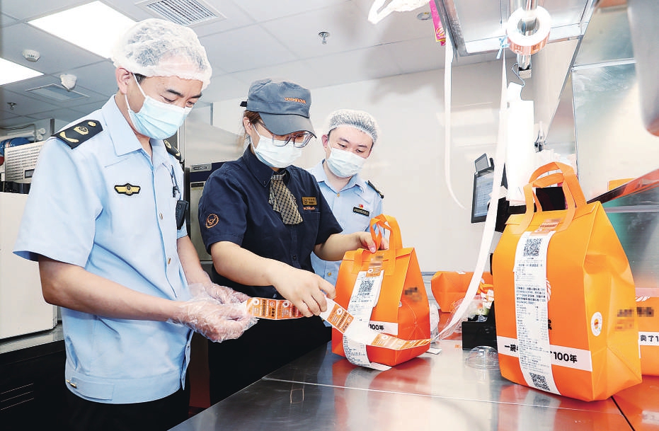 圖為執(zhí)法人員在外賣(mài)企業(yè)檢查“食安封簽”落實(shí)情況。