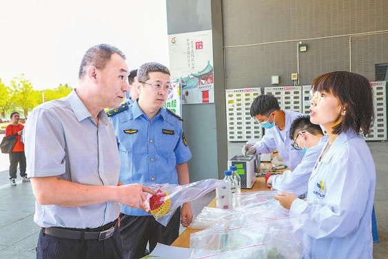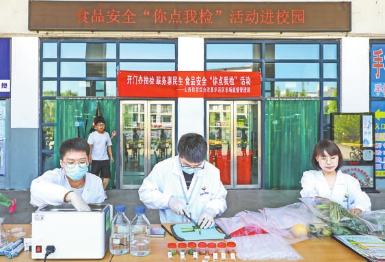 “您好,我們可以自己選擇檢測(cè)食品嗎?”6月21日,在太原學(xué)院餐廳門前,很多大學(xué)生圍在山西綜改區(qū)市場(chǎng)監(jiān)管局設(shè)立的“你點(diǎn)我檢”桌前向工作人員提問。該局食品監(jiān)管科副科長(zhǎng)吳煒耐心給學(xué)生們講解:“沒問題,咱們掃碼后可以根據(jù)需求選擇,我們會(huì)根據(jù)大家的選擇進(jìn)行相關(guān)檢測(cè)?!睅孜粚W(xué)生在吳煒的引導(dǎo)下進(jìn)行了操作,同時(shí)觀看了食品安全快檢流程?!拔覀兊牟妥谰涂磕銈儽O(jiān)督,必須給你們點(diǎn)贊!”幾位同學(xué)對(duì)市場(chǎng)監(jiān)管部門的工作表示贊揚(yáng)。